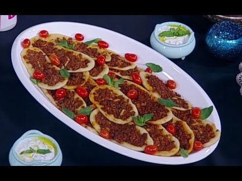 4. مقداری روغن زیتون روی نان پیتا (یا نان تافتون به صورت گرد برش خرده) بمالید و از مخلوط گوشت و ادویه روی آن بگذارید. سپس آن را در طبقه وسط فر از قبل با دمای 180 درجه سانتی گراد گرم شده به مدت 8 دقیقه بپزید.