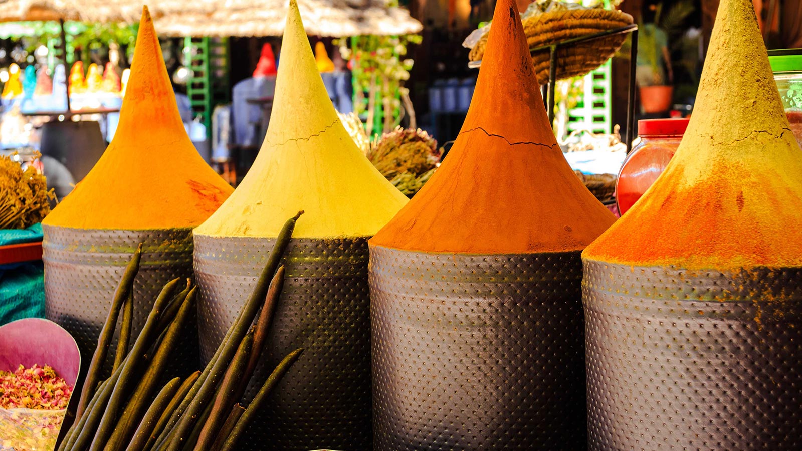 به دلیل وجود پوشش انبوه درخت در نواحی رشته کوه اطلس، گردو و بادام زیادی از این منطقه برداشت شده و توسط ساکنان محلی بو داده میشوند. در جنوب مراکش هم انواع مختلفی از درختان نخل و خرما رشد میکند. بهترین منطقه برای امتحان کردن طعم خرماهای مراکشی، بازار خرما در منطقه «الریصانی» است اما مغازههای فروش میوه خشک، آجیل و خرما در سراسر مدینه در دسترس هستند. برگههای زردآلو و انجیر خشک شده نیز در اغلب مغازهها برای چشیدن در دسترس مشتریان هستند.