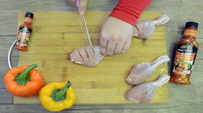مثل تصویر زیر با چاقو برشهای سطحی روی ران مرغ بزنید. تا چاشنی که در ادامه خواهیم گفت به همه گوشت مرغ نفوذ و ران، مغز پخت شود.