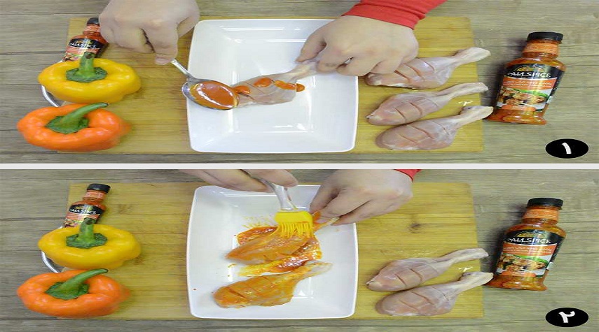 به ازای هر کیلوگرم ران مرغ ۲ الی ۳ قاشق غذا خوری از چاشنی بلوچی با برس مخصوص آشپزی بر روی ران مرغ بمالید.