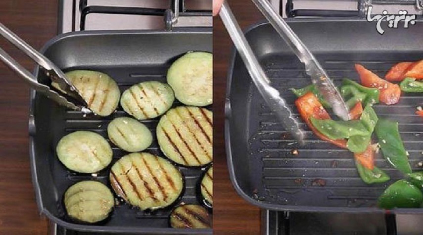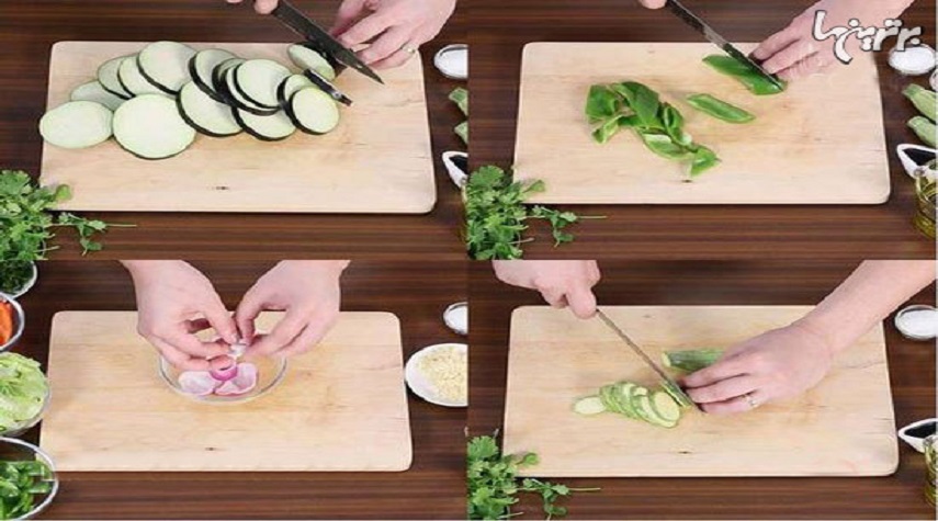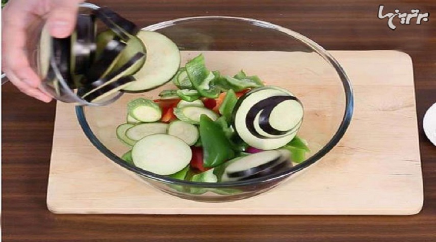 1- فلفل دلمه ای، بادمجان، پیاز و کدو سبز را ورقه ورقه کنید.