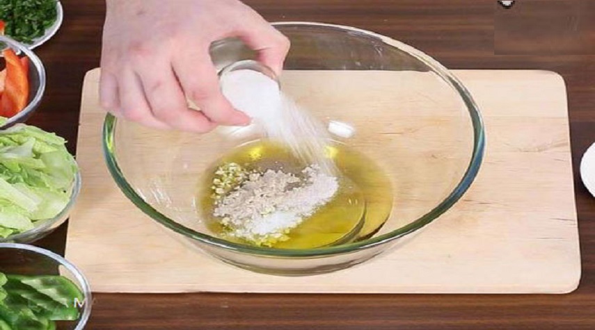 4- برای آماده کردن مخلوط سالاد، روغن زیتون را در یک کاسه بزرگ بریزید. سیر خرد شده و پودر فلفل و نمک را به آن اضافه کنید.
