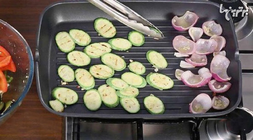 6- یک ماهیتابه چدنی برداشته و پیاز و کدو سبز را درون آن بریزید تا دو طرفش کباب شود.