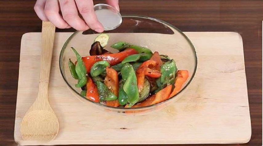 5- پیاز، بامجان، فلفل دلمهای و کدو سبز را با هم ترکیب کنید. مخلوط روغن را روی آن ریخته و خوب هم بزنید تا زمانی که همه مواد کاملا ترکیب شوند.