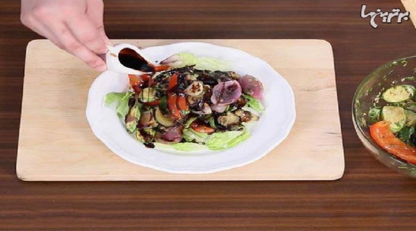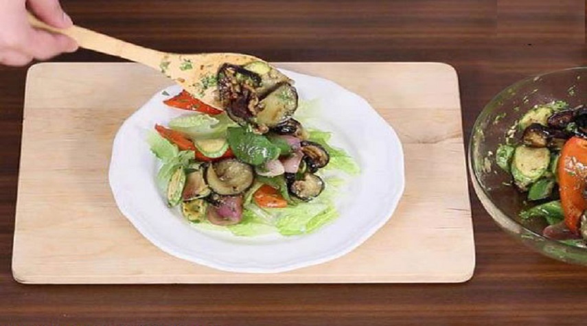 9- کاهوها را در یک بشقاب خرد کنید و سبزیجات گریل شده را روی آنها بریزید.