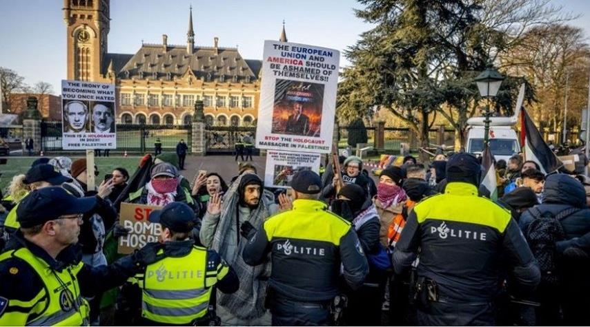 حامیان فلسطین همزمان با آغاز جلسات محاکمه رژیم صهیونیستی، در مقابل ساختمان دیوان بین المللی در شهر لاهه هلند تظاهرات برگزار کردند.