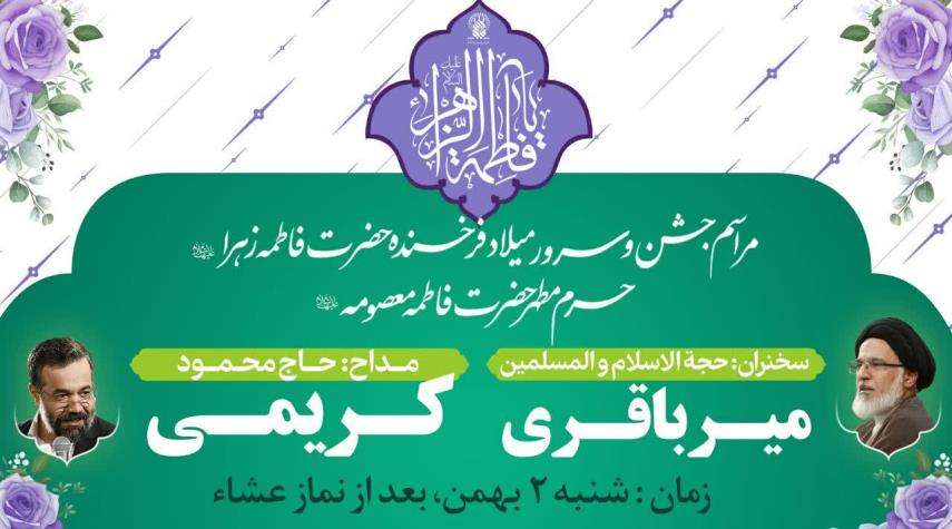 تهران - الکوثر : مراسم جشن شب میلاد حضرت فاطمه زهرا سلام الله علیها در حرم مطهر حضرت معصومه سلام الله علیها با سخنرانی حجت الاسلام والمسلمین میرباقری و مداحی محمود کریمی برگزار می شود.