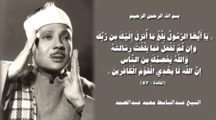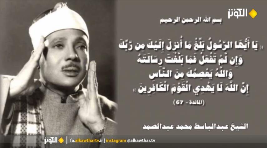 تهران- الکوثر: تلاوت آیه 67 سوره مائده که به آیه بلاغ یا آیه تبلیغ معروف است و به موضوع غدیر می پردازد را با نوای استاد مرحوم عبدالباسط محمد عبدالصمد می شنویم.