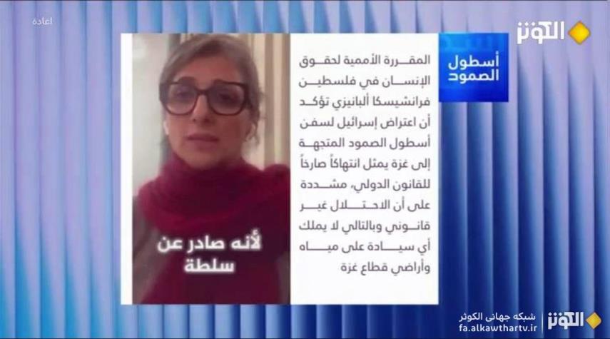 گزارشگر ویژه حقوق بشر: توقیف ناوگان ایستادگی توسط رژیم صهیونیستی غیرقانونی است| اسطول الصمود