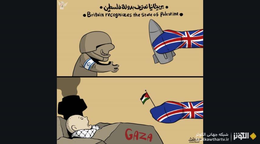 کاریکاتور کمال شرف، هنرمند برجسته یمنی، نقدی هنرمندانه و دقیق به تضاد و تناقض سیاستهای بریتانیا در قبال مسئله فلسطین ارائه میدهد. این اثر نشاندهنده برخورد دوگانه بریتانیا است که همزمان با اعلام به رسمیت شناختن دولت فلسطین، روابط پیچیده و حمایتهای متناقضی از رژیم صهیونیستی دارد.