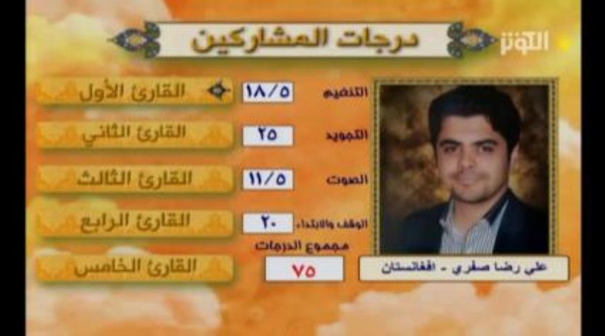 تهران - ویژه الکوثر : تلاوت آیاتی از سوره رعد توسط «علی رضا صفری» شرکت کننده از افغانستان در یازدهمین شب مسابقات بین المللی «مفازا» در شبکه الکوثر.