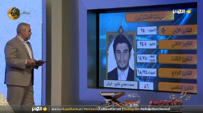 تهران - ویژه الکوثر : «محمدمهدی شمس ناتری» قاری شرکت کننده از جمهوری اسلامی ایران در سی امین شب از پانزدهمین دوره مسابقات قرآنی رمضانی «ان للمتقین مفازا» که در شبکه الکوثر برگزار شد ، آیاتی از سوره یونس را تلاوت کرد و به عنوان نفر اول این مسابقات معرفی شد.