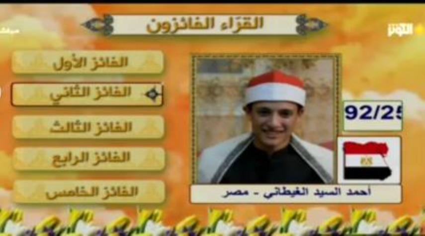 تهران - ویژه الکوثر : تلاوت آیاتی از سوره توبه توسط «احمد السید الغیطانی» از مصر در آخرین شب و مرحله نهایی مسابقات بین المللی «مفازا» در شبکه الکوثر.