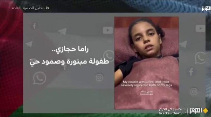 راما حجازي، کودک ۱۱ ساله فلسطینی، نمونهای بارز از صبر و مقاومت کودکان مظلوم فلسطین است که تحت ظلم و یورش رژیم صهیونیستی، دچار جراحات شدید شد و هر دو پای خود را از دست داد. داستان جانکاه این دخترک در برنامه «فلسطین الصمود» بازتاب دهنده مظلومیت و استقامت فرزندان این سرزمین است که علیرغم شکنجهها و رنجها، همچنان ایستاده و مقاوم باقی ماندهاند.