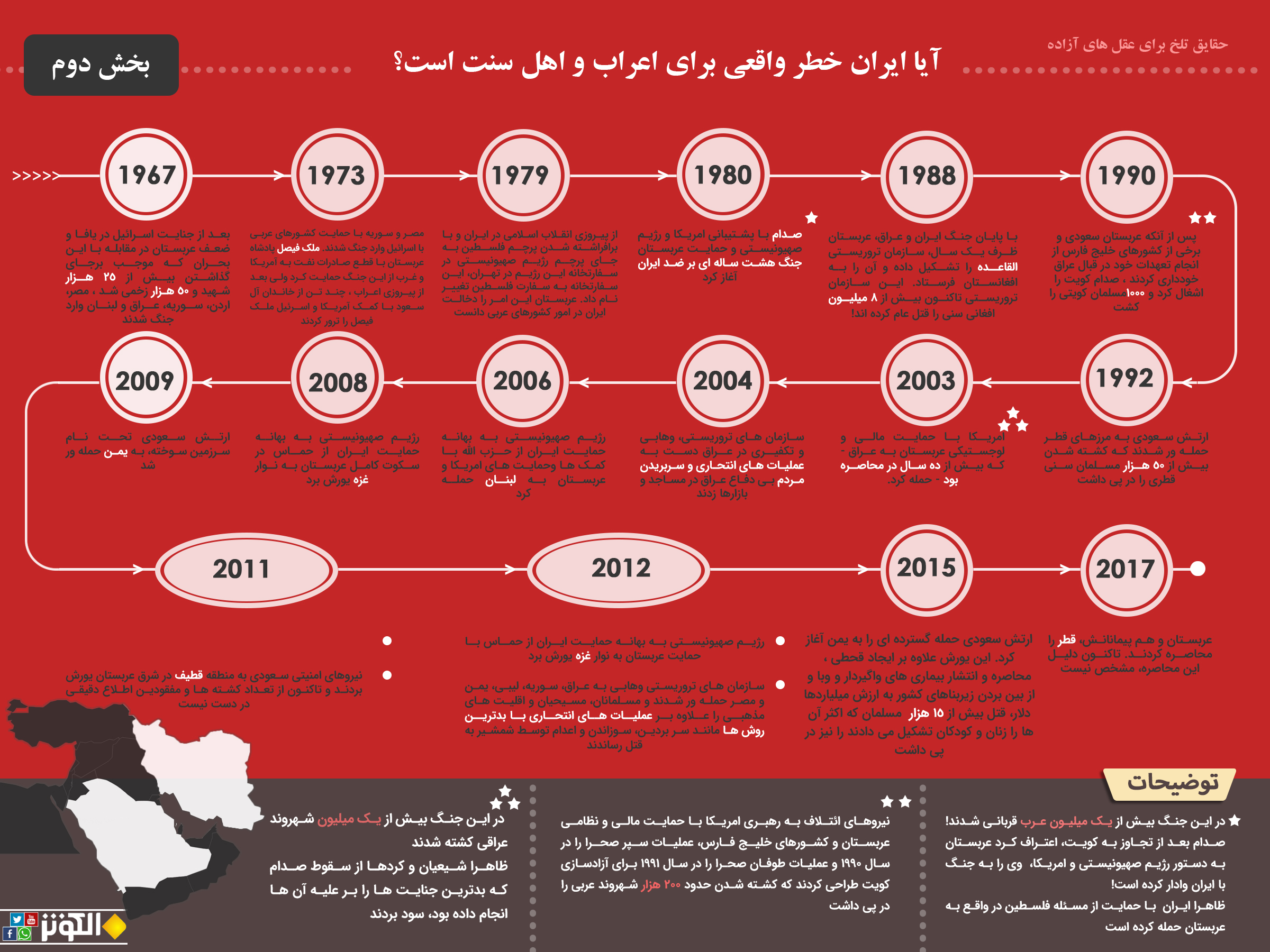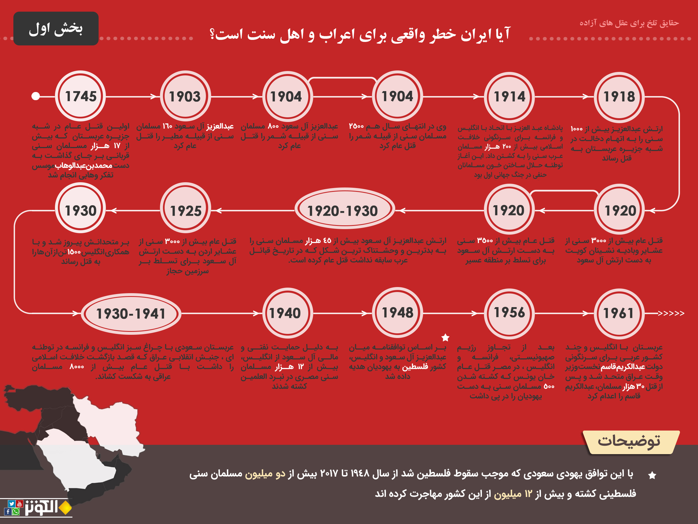 به گزارش پایگاه شبکه الکوثر، بررسی کارنامه رژیم وهابی آل سعود از سال 1745 تا کنون نشان می دهد این رژیم به طور مستقیم یا غیرمستقیم مسئول قتل میلیون ها مسلمان سنی در منطقه بوده است. در تصاویر زیر جنایات آل سعود علیه امت اسلامی از سال 1745 یعنی زمان آغاز کشتار مسلمانان به دست پیروان محمد بن عبدالوهاب بنیانگذار وهابیت تاکنون خلاصه شده است.