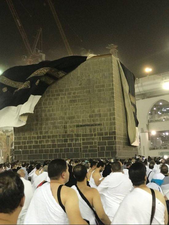 دیوارهای خانه خدا که پیوسته زیر پرده مشکی رنگ کعبه مشرفه پنهان بودند با این تندباد نمایان شدند.