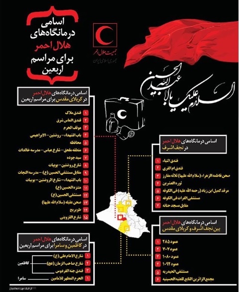 به گزارش پایگاه شبکه الکوثر، پایگاه جمعیت هلال احمر در اطلاعیه ای اسامی ٣٢ درمانگاه هلال احمر را در شهرهای نجف اشرف، كربلا، بین نجف اشرف و كربلا و در كاظمین و سامرا برای خدمت رسانی به زائرین اربعین اعلام كرد. وجود این درمانگاه ها و ارائه خدمات لازم كمك شایانی به كیفیت پیاده روی اربعین می كند. اسامی این پایگاه ها در تصویر زیر آمده است.