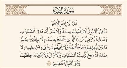 اللَّهُ لَا إِلَٰهَ إِلَّا هُوَ الْحَيُّ الْقَيُّومُ ۚ لَا تَأْخُذُهُ سِنَةٌ وَلَا نَوْمٌ ۚ لَّهُ مَا فِي السَّمَاوَاتِ وَمَا فِي الْأَرْضِ ۗ مَن ذَا الَّذِي يَشْفَعُ عِندَهُ إِلَّا بِإِذْنِهِ ۚ يَعْلَمُ مَا بَيْنَ أَيْدِيهِمْ وَمَا خَلْفَهُمْ ۖ وَلَا يُحِيطُونَ بِشَيْءٍ مِّنْ عِلْمِهِ إِلَّا بِمَا شَاءَ ۚ وَسِعَ كُرْسِيُّهُ السَّمَاوَاتِ وَالْأَرْضَ ۖ وَلَا يَئُودُهُ حِفْظُهُمَا ۚ وَهُوَ الْعَلِيُّ الْعَظِيمُ (255) لَا إِكْرَاهَ فِي الدِّينِ ۖ قَد تَّبَيَّنَ الرُّشْدُ مِنَ الْغَيِّ ۚ فَمَن يَكْفُرْ بِالطَّاغُوتِ وَيُؤْمِن بِاللَّهِ فَقَدِ اسْتَمْسَكَ بِالْعُرْوَةِ الْوُثْقَىٰ لَا انفِصَامَ لَهَا ۗ وَاللَّهُ سَمِيعٌ عَلِيمٌ (256) اللَّهُ وَلِيُّ الَّذِينَ آمَنُوا يُخْرِجُهُم مِّنَ الظُّلُمَاتِ إِلَى النُّورِ ۖ وَالَّذِينَ كَفَرُوا أَوْلِيَاؤُهُمُ الطَّاغُوتُ يُخْرِجُونَهُم مِّنَ النُّورِ إِلَى الظُّلُمَاتِ ۗ أُولَٰئِكَ أَصْحَابُ النَّارِ ۖ هُمْ فِيهَا خَالِدُونَ (257)