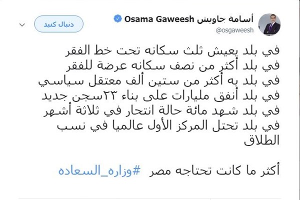«اسامه جاویش» نیز شرایط اجتماعی و اقتصادی مصر را یاد آور شد و نوشت: کشوری که یک سوم مردمانش زیر خط فقر زندگی میکنند و نیمی از ساکنانش در آستانه فقر قرار دارند؛ کشوری که بیش از 60 هزار زندانی سیاسی دارد و هر سه ماه شاهد 100 مورد خودکشی است، بیش از هر چیزی نیاز به وزارت خوشبختی نیاز دارد!».