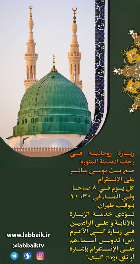 به گزارش پایگاه شبکه الکوثر ، زیارت معنوی و روحانی مرقد مطهر پیامبر اکرم (ص) هر روز ساعت 8 صبح و 10 و 30 دقیقه شب به وقت تهران از طریق اینستاگرام به صورت زنده و مستقیم پخش می شود.
