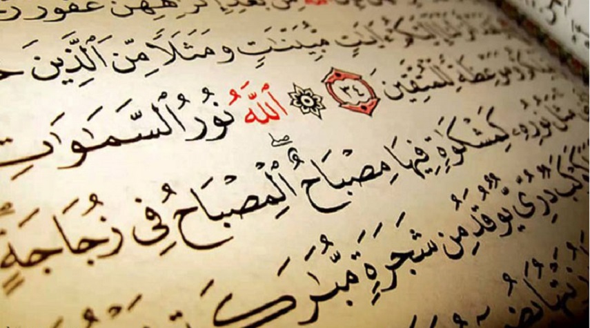 اللَّهُ نُورُ السَّمَاوَاتِ وَالْأَرْضِ مَثَلُ نُورِهِ كَمِشْكَاةٍ فِيهَا مِصْبَاحٌ الْمِصْبَاحُ فِي زُجَاجَةٍ الزُّجَاجَةُ كَأَنَّهَا كَوْكَبٌ دُرِّيٌّ يُوقَدُ مِنْ شَجَرَةٍ مُبَارَكَةٍ زَيْتُونَةٍ لَا شَرْقِيَّةٍ وَلَا غَرْبِيَّةٍ يَكَادُ زَيْتُهَا يُضِيءُ وَلَوْ لَمْ تَمْسَسْهُ نَارٌ نُورٌ عَلَى نُورٍ يَهْدِي اللَّهُ لِنُورِهِ مَنْ يَشَاءُ وَيَضْرِبُ اللَّهُ الْأَمْثَالَ لِلنَّاسِ وَاللَّهُ بِكُلِّ شَيْءٍ عَلِيمٌ ﴿۳۵﴾