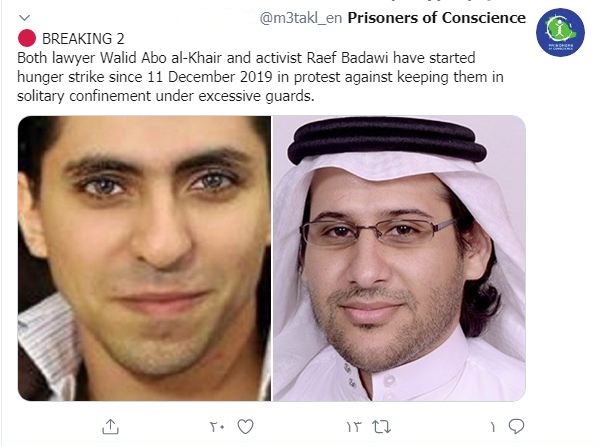در همین حال «ولید ابوالخیر» وکیل و «رائف بدوی» فعال حقوق بشر نیز از 11 دسامبر (20 آذر) اعتصاب غذا کردهاند. آنها به شرایط نگهداری خود در انفرادی اعتراض دارند.