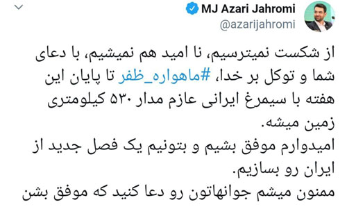 به گزارش پایگاه شبکه الکوثر، آذری جهرمی با انتشار این ویدیو در حساب کاربری خود در توییتر نوشت: از شکست نمیترسیم، نا امید هم نمیشیم، با دعای شما و توکل بر خدا، ماهواره ظفر تا پایان این هفته با سیمرغ ایرانی عازم مدار ۵۳۰ کیلومتری زمین میشه.