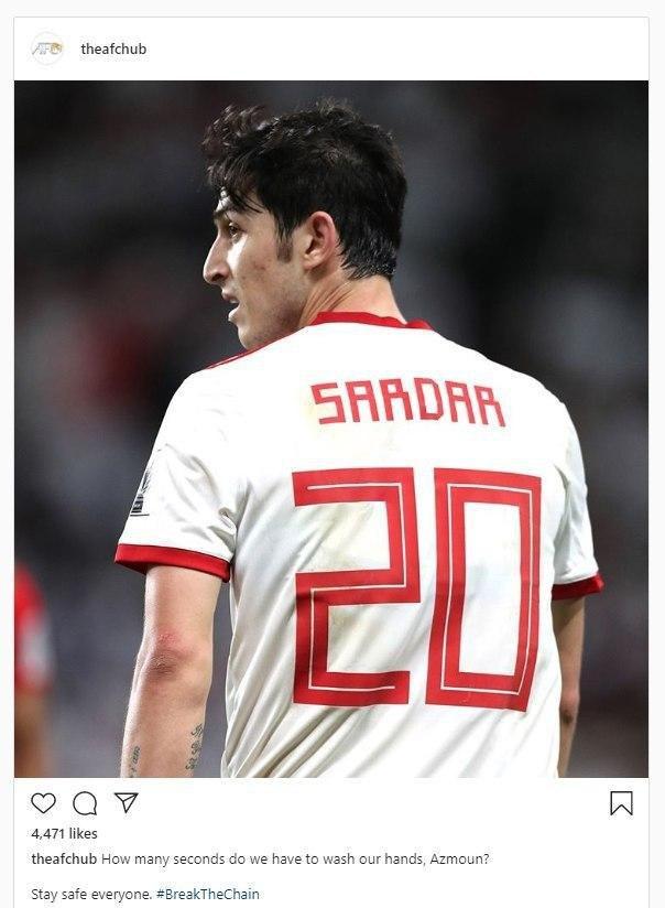 از این رو صفحه اینستاگرام کنفدراسیون فوتبال آسیا AFC با انتشار تصویری از سردار آزمون که شماره ۲۰ پیراهن تیم ملی کشورمان را بر تن دارد، اشاره داشت برای مقابله با ویروس کرونا باید ۲۰ ثانیه دستها را شست.