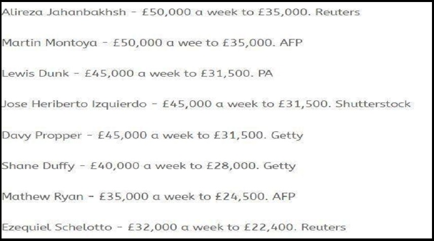 به نوشته این رسانه معروف هلندی در حال حاضر علیرضا جهانبخش در کنار مارتین مونتویا ستاره اسپانیایی سابق بارسلونا با دستمزد هفتگی ۵۰ هزار پوند بالاترین دستمزد را در بین ستاره های برایتون دریافت می کنند که با کاهش ۳۰ درصدی قراردادها این رقم به ۳۵ هزار پوند در هفته کاهش پیدا کرده است.