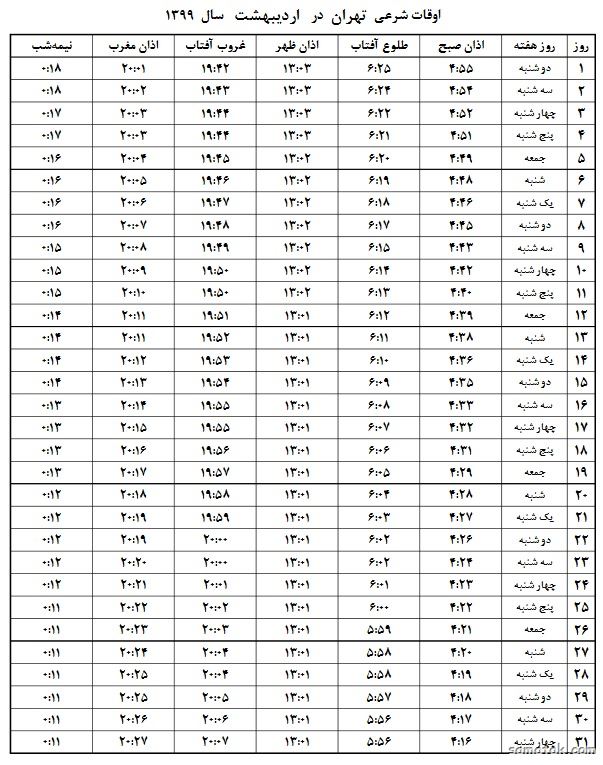 اوقات شرعی ماه رمضان ۹۹ تهران: