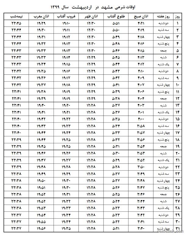 اوقات شرعی ماه رمضان ۹۹ مشهد: