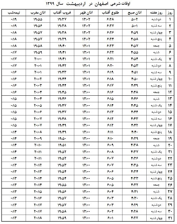 اوقات شرعی ماه رمضان ۹۹ اصفهان:
