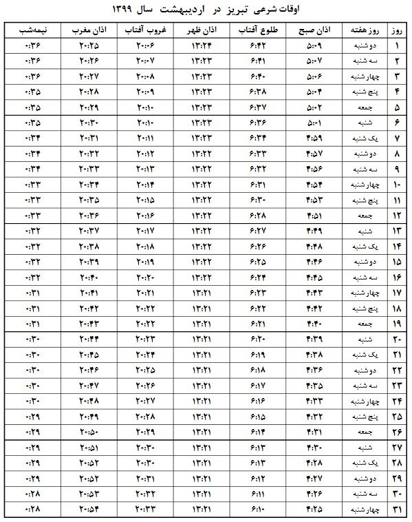 اوقات شرعی ماه رمضان ۹۹ تبریز: