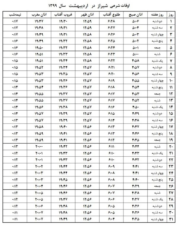 اوقات شرعی ماه رمضان ۹۹ شیراز:
