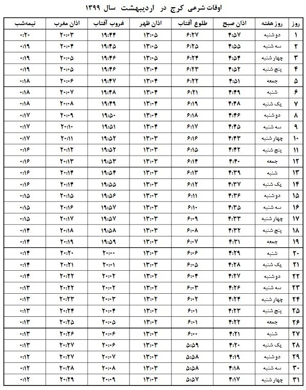 اوقات شرعی ماه رمضان ۹۹ کرج: