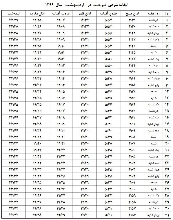 اوقات شرعی ماه رمضان ۹۹ بیرجند:
