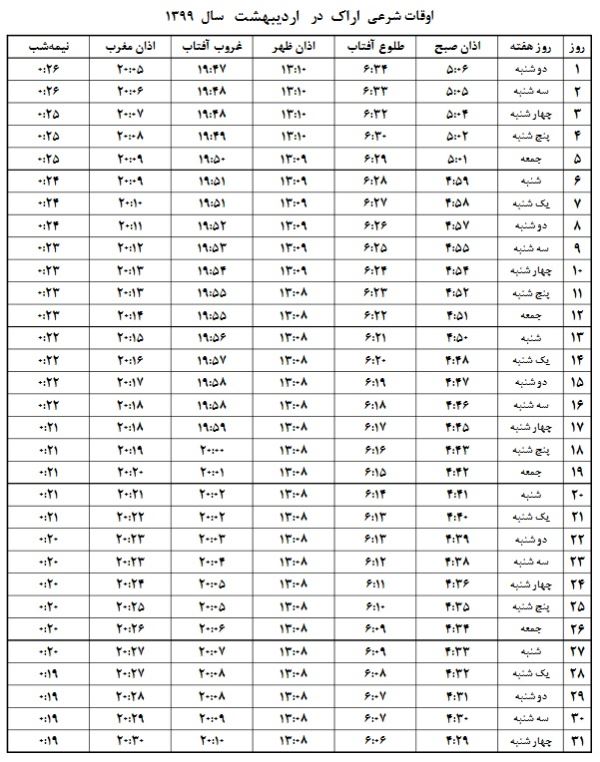 اوقات شرعی ماه رمضان ۹۹ اراک:
