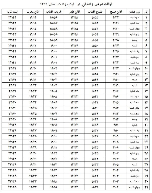 اوقات شرعی ماه رمضان ۹۹ زاهدان: