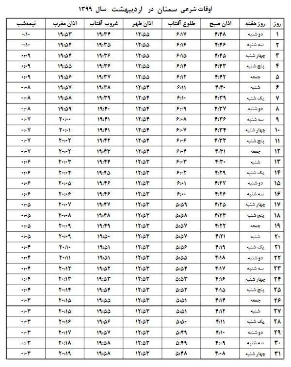 اوقات شرعی ماه رمضان ۹۹ سمنان: