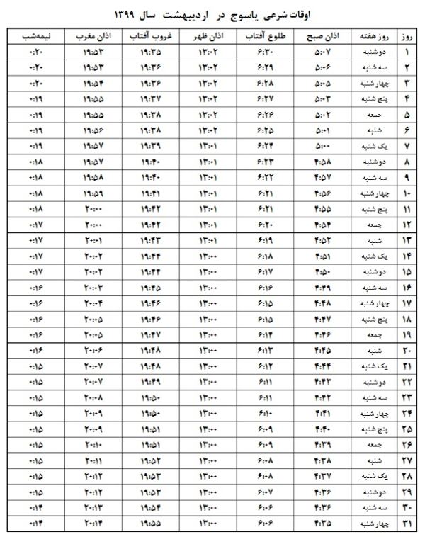 اوقات شرعی ماه رمضان ۹۹ یاسوج: