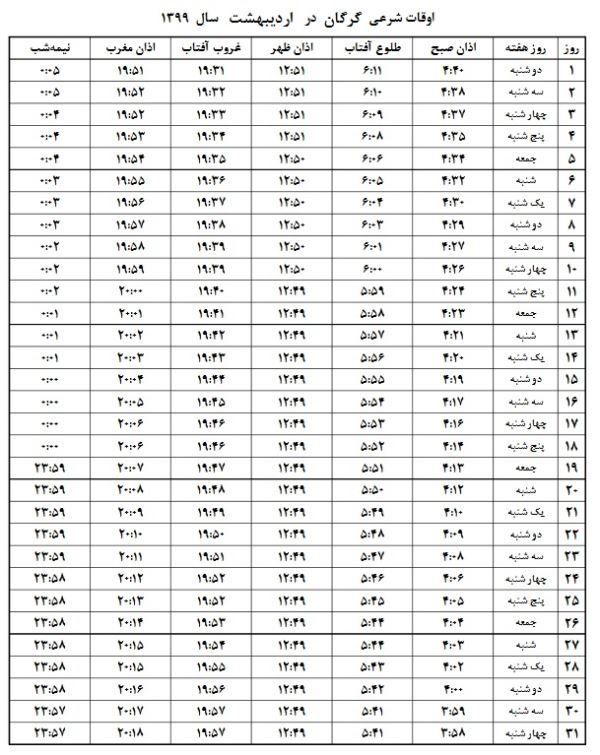 اوقات شرعی ماه رمضان ۹۹ گرگان: