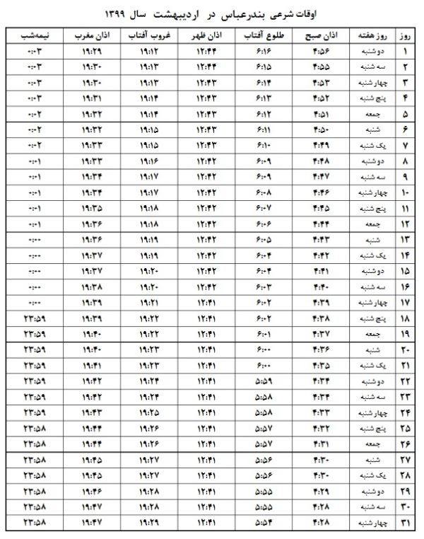 اوقات شرعی ماه رمضان ۹۹ بندرعباس: