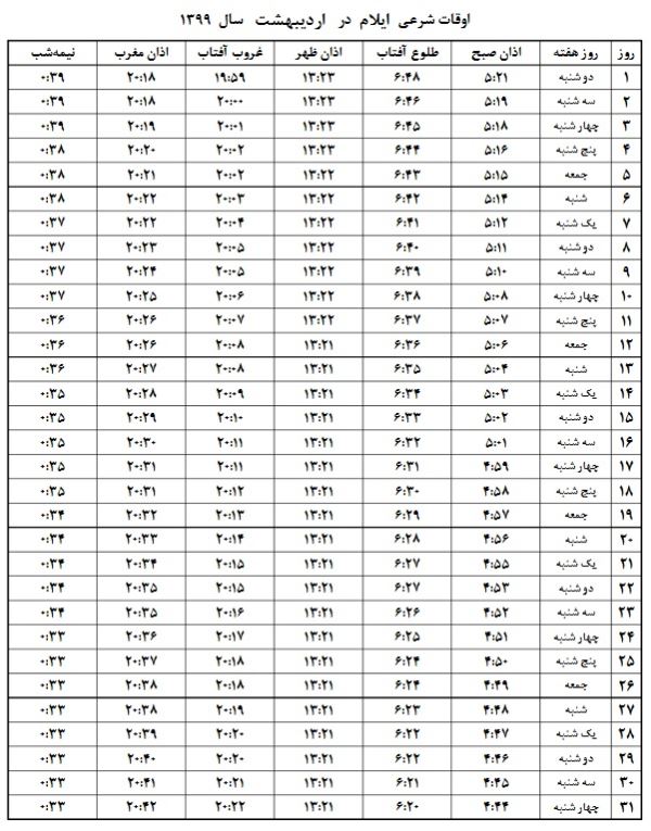 اوقات شرعی ماه رمضان ۹۹ ایلام: