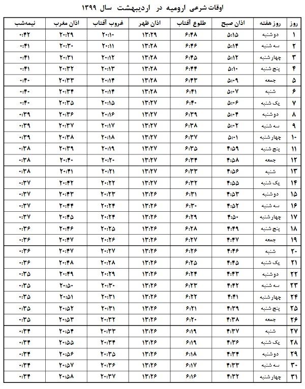 اوقات شرعی ماه رمضان ۹۹ ارومیه: