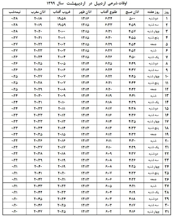 اوقات شرعی ماه رمضان ۹۹ اردبیل: