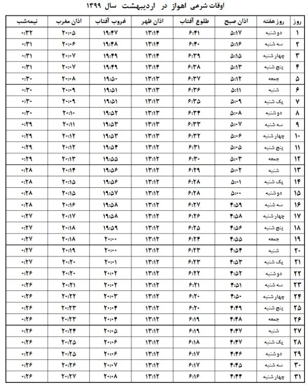 اوقات شرعی ماه رمضان ۹۹ اهواز: