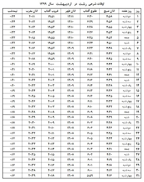 اوقات شرعی ماه رمضان ۹۹ رشت:
