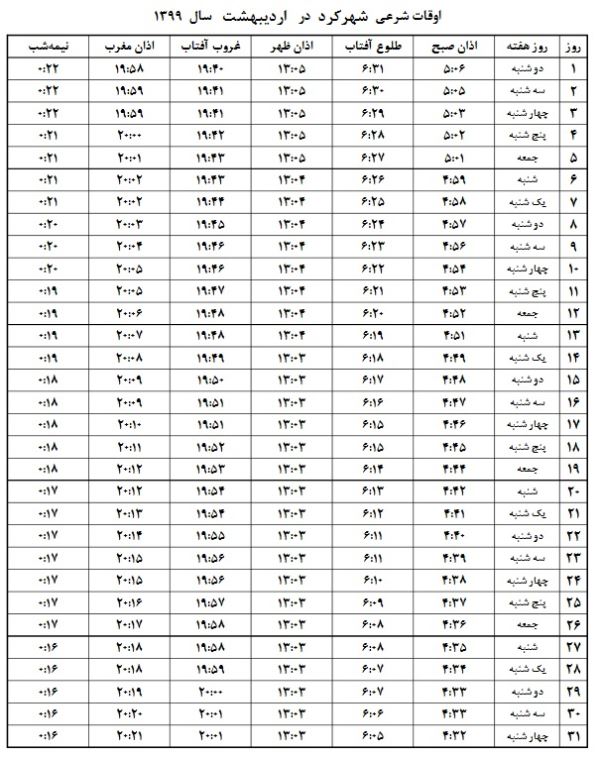 اوقات شرعی ماه رمضان ۹۹ شهرکرد: