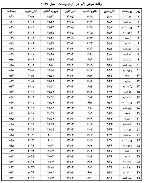 اوقات شرعی ماه رمضان ۹۹ قم: