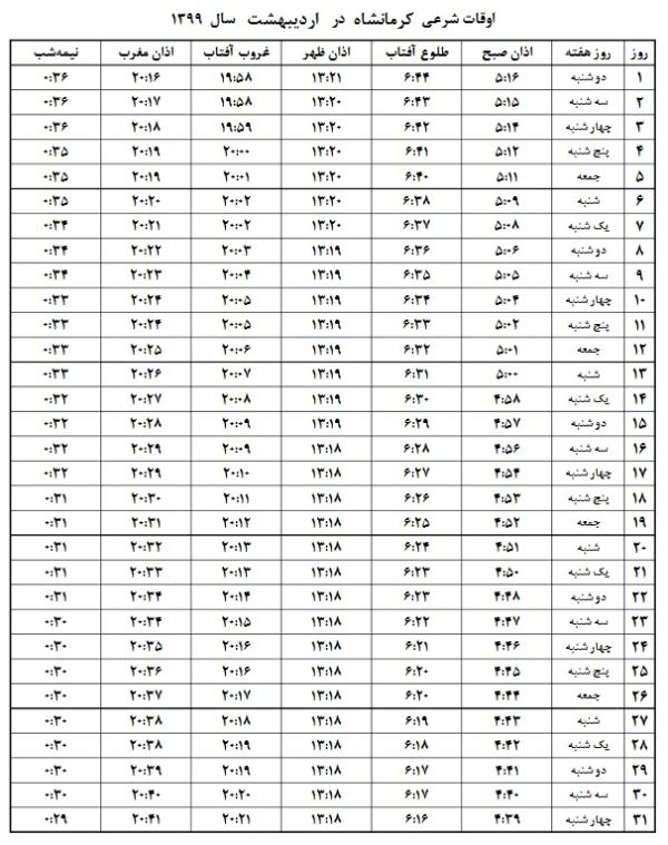 اوقات شرعی ماه رمضان ۹۹ کرمانشاه:
